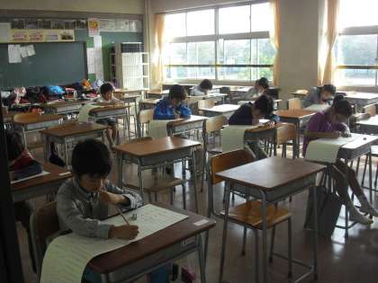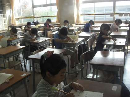 ようがの学び舎では漢字に興味をもち、主体的に学習に取り組む子どもを育てるために、1年に2回ですが毎年この時期に学び舎3校合同の漢字検定を行っています。会場の用賀中学校に漢字検定に申し込んだ3校の子どもたちが集まり、真剣な態度で検定に臨んでいました。