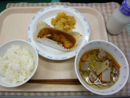 チャンチャン焼きは、鮭などの魚と野菜を鉄板で焼いた料理です。給食では、鮭の上に炒めた野菜をのせて、オーブンで焼きました。チャンチャン焼きは、野菜たっぷりで栄養満点です。残さず食べましょう。