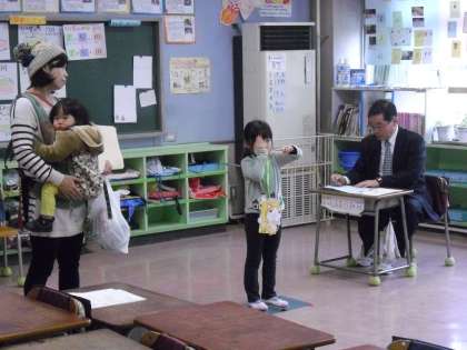 11/6 就学時健康診断 公開日 2014/11/06 更新日 2014/11/06 その他 来年の4月に用賀小学校に入学する子どもたちが健康診断を受けるために学校に来ました。少々緊張気味の子もいましたが、おうちの方に手を引かれながらいろいろな健診を受けました。「ありがとうございました」「さようなら」とあいさつもしっかりでき、頼もしい子どもたちです。 子どもたちとの時間を過ごす中で、5ヶ月後はこの子たちが用賀小学校の1年生として入学してくることを実感しました。入学の日が楽しみです。