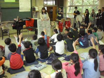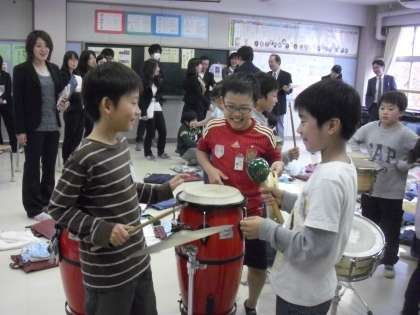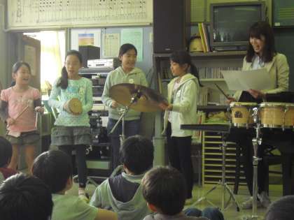 月曜日に続いて今週2回目の研究授業。今日の授業者は教員2年目の音楽の深水先生。4年3組の子どもたちと音楽つくりの学習をしました。