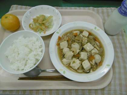 豆腐には、体をつくってくれる「たんぱく質」や、骨や歯をつよくしてくれる「カルシウム」がたくさん入っています。残さず食べましょう。