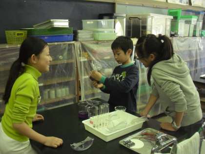 世田谷区の小学校科学センターの会場校として行ってきた理科実験教室も今日が最後です。今日は酸性とアルカリ性の実験です。酢や塩酸、炭酸水素ナトリウム水溶液などに紫キャベツの汁をたった1mL入れただけで、驚くほど色が変化をしました。この化学変化に子どもたちは大変興味を示し、そしてその理由を考えていました。