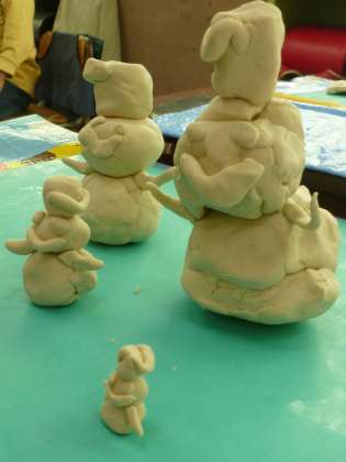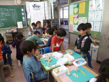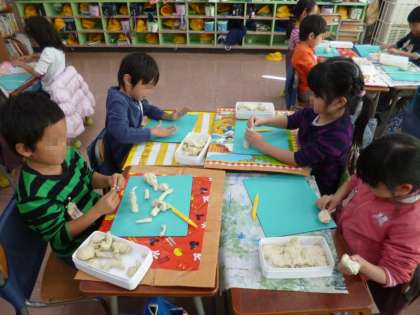どうやら今日は粘土を使って何かをつくっているようです。みんな熱心に粘土をこねたり形をつくったり、棒や板に貼りつけたり、集中してつくっています。「秋や冬」をテーマにして思い思いの世界を粘土板の上に広げていきます。