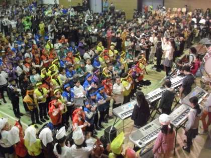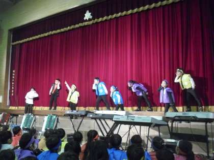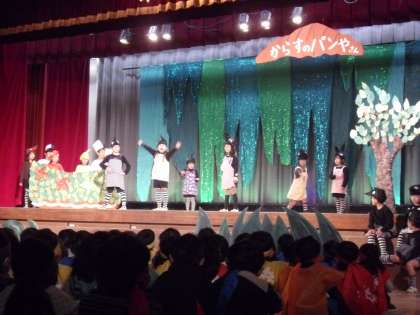 子どもたちが待ちに待った学芸会の日になりました。初日の今日は児童鑑賞日。互いに劇を見合います。オープニングは2年生のかわいい初めの言葉。そして全員で幕を開ける歌を歌い、いよいよ劇の始まりです。