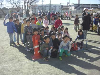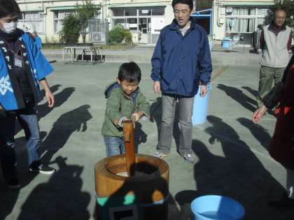 1年生は初めての用賀小のもちつき。用賀小学校のもちつきは子どもたちが全員自分の手で杵を持ち、もちをつきます。1年生の中には初めて経験する子もいます。力強くつく子もいれば、杵を重たそうにしてつく子もいましたが、みな自分の力でつくことができました。