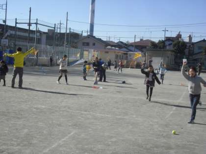そして、校庭に出てのたこ上げ。初めはなかなか思うように上がりませんでしたが、慣れてくると少しずつ上手に上げられるようになってきました。子どもたちは自分の作ったたこで夢中になってたこ上げを楽しんでいました。
