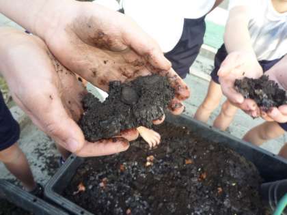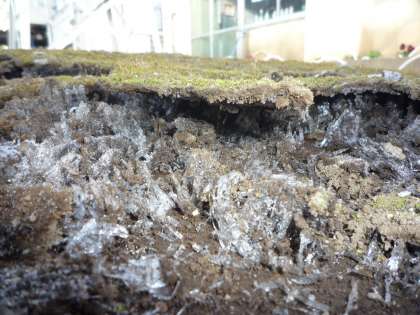 正門わきの百葉箱の周りの土が霜柱でもちあげられていました。不思議そうな1・2年生に高学年が一生懸命説明していました。