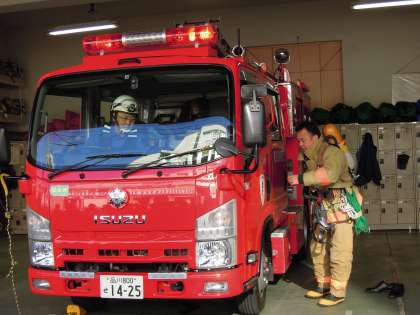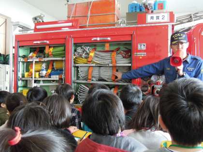 玉川消防署用賀出張所では、出動訓練の実演をしていただいたり、消防車や隊員の方々の装備など消防署の仕事に関わる様々な物の紹介をしていただいたりしました。とても貴重な経験になりました。消防署の方々、お忙しい中どうもありがとうございました。