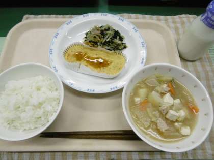 1/21 本日の給食 公開日 2015/01/22 更新日 2015/01/22 給食 〜今日の献立〜 ごはん 牛乳 千草焼き 野菜の磯香和え 豚汁 〜給食メモ〜 今日は、千草焼きに使った「たまご」のクイズを出したいと思います。たまごにたくさん入っている、体をつくるはたらきをする栄養素は、次のうちのどれでしょうか? 1.たんぱく質 2.食物繊維 3.ビタミンC ※クイズのこたえは、「食材がとれたところ…」の最後にのせています。 食材がとれたところ・・・ 閉じる 米…埼玉県 豚肉…青森県 鶏卵…岩手県 えび…ベトナム たまねぎ…北海道 にんじん…千葉県 ほうれん草…埼玉県 もやし…群馬県 ごぼう…青森県 だいこん…神奈川県 じゃがいも…長崎県 長ねぎ…千葉県 クイズのこたえは、1の「たんぱく質」です。たまごは栄養いっぱいの食べもので、たくさんの栄養素がバランスよく入っています。しかし、食物繊維やビタミンCはあまり入っていないので、食物繊維やビタミンCがたくさん入っている野菜などと一緒に食べましょう。