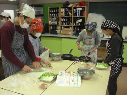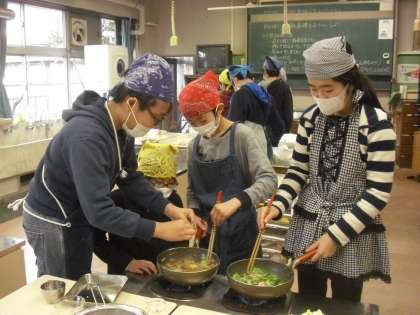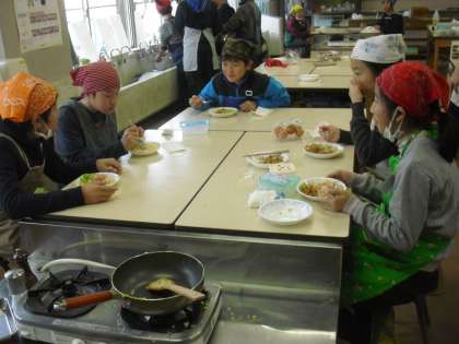 そしてお楽しみの試食。自分たちで作ったものはおいしさもひとしおで、みな笑顔でした。班の友達ともよく協力をして、楽しく調理実習ができました。