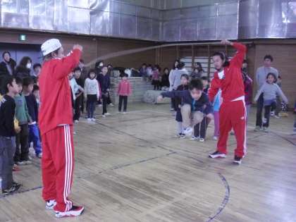 2本の縄が回る中を跳ぶことに戸惑っていた子どもたちでしたが、講師の方に教えていただきながら、わずかの間に跳べるようになりました。また、親子でのダンスタイムでは、お母様方も音楽に合わせて楽しく踊っていました。