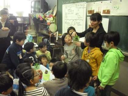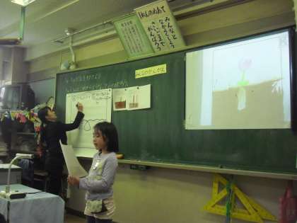 子どもたちは1学期の朝顔の栽培の学習を参考にしながら、成長の様子を熱心に絵にし、それを発表し合いました。そして、最後に赤城先生が水栽培で育てた球根を提示すると、子どもたちは食い入るように見つめ、活発に気付いたことを発表しました。