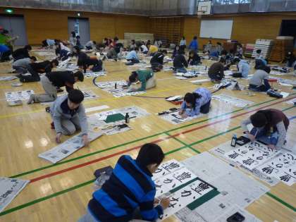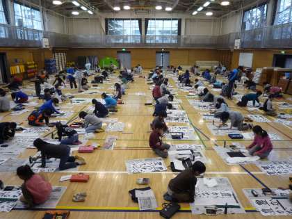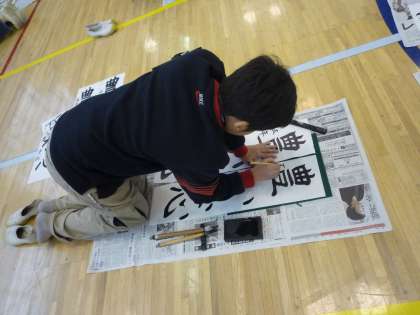 体育館を開けてみると、シーンとした中で5年生が書き初めをしていました。130人近くの子どもたちがいるとは思えないほどの静けさの中で、心を落ち着かせて一心に書いています。