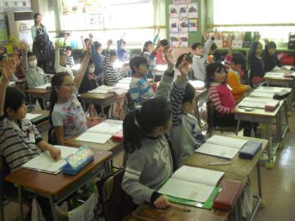 2/14 土曜公開1 公開日 2015/02/14 更新日 2015/02/14 今日のできごと 今日は土曜公開。朝から多くの保護者の方が子どもたちの学習の様子を見てくださっています。 1年生の算数の授業では多くの子が進んで手を挙げ、活発に学習をしていました。2年生は東京農業大学の古庄先生と学生さんたちによる食育の授業。これは用賀小学校の特色です。子どもたちは野菜の紙芝居に興味津津です。3年生は日景先生の書写の授業。まだ始めて1年の毛筆ですが、皆しっかりとした文字を書いていました。