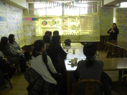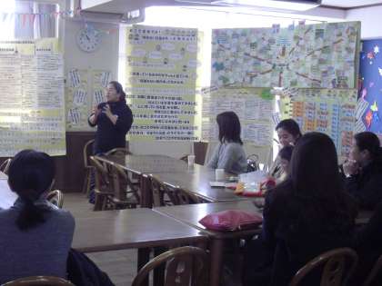会場のランチルームの壁一面には報告に使った模造紙が貼り出されました。その量もさることながら内容がまたすばらしく、親として子どもに対してたくさんの思いに溢れたものです。研修フェアでは他校の多くの方に読んでいただき、うれしい感想をたくさんいただきました。