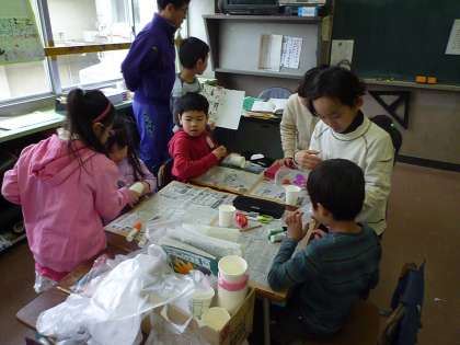 2年生が生活科の学習で「おもちゃランド」を開催し、一年生との交流をしました。1,2年生合同の6、7人グループで、一緒におもちゃを作り、作ったおもちゃで遊びました。びゅんびゅんごま、ぷかぷかボール、レーシングカー、ぴょんぴょんがえる、コップロケットなど身近にある材料を使って、おもちゃを作りました。