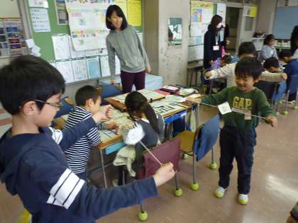 2年生は、招待状や作り方のポスター、材料集めなど、今日のおもちゃランドに向けて、準備を進めてきました。1年生に分かりやすく教えられるか心配で、とても緊張していた様子の2年生でしたが、大きな声で作り方の説明をしたり、優しく1年生に教えたりすることが出来ました。「1年生が楽しかったと言ってくれて良かった。」「ありがとうと言ってくれて嬉しかった。」と感想を述べていました。