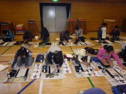各学年が、それぞれの場所で書き初めをしています。1・2年生は硬筆書写、3年生以上が習字になります。5・6年生は体育館で席書会をしました。6年生は、平和な春 ですが、バランスがとても難しくて苦労していました。でも立派な仕上がりです。