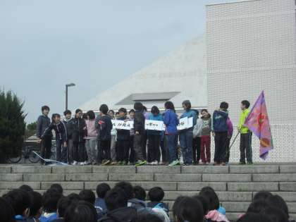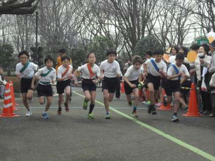 2/24 5,6年駅伝大会1 公開日 2015/02/24 更新日 2015/02/24 今日のできごと 今日は子どもたちが待ちに待った駅伝大会の本番。子どもたちはこの日に向けて苦しい練習をクラスメイトと励ましながら積み重ねてきました。その練習の成果を発揮する日です。 まずはスタート前のクラスごとの決意表明。ユーモアを交えながらも自分たちの思いを伝えていました。 そして、たくさんの保護者が見守る中、程よい緊張感に包まれながら6年、5年の順に第一走者がスタートを切りました。