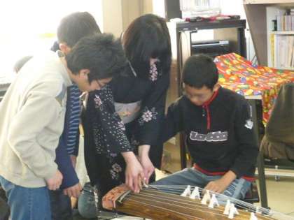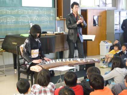 尺八とお箏の先生をお呼びして、6年生が日本の音楽について学びました。2クラスずつ音楽室に入り、間近でプロの演奏を聴きました。曲目は、『春の海』『六段の調べ』『さくら変奏曲』でした。京都の八ツ橋のお菓子は、八橋検校の名にちなんでお箏の形をしていることや、尺八の穴はたった5つだけど首を振ることによって様々な音が出せることなど他にもたくさん教えていただきました。最後には、実際に楽器を触らせていただきました。貴重な体験をありがとうございました。