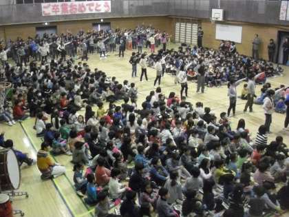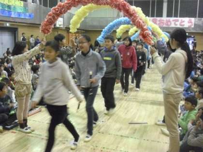 花のアーチをくぐって6年生が入場。そして1年生から歌や合奏などを送りました。1年生は入学の日から6年生に教えてもらったり、遊んでもらったり、思い出がいっぱいです。そんなことを思い出しながら元気よく歌いました。どの学年もよく工夫し、練習した出し物で体育館が熱気に包まれました。