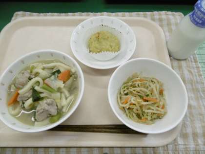 今日の給食は、東京都の八丈島でよくとれる、明日葉やむろあじ、糸寒天、さつまいもを使った、八丈島献立です。八丈島の味を味わってみて下さい。