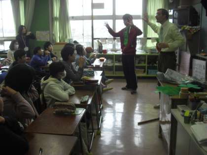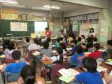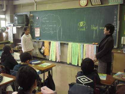 3/9 5,6年英語活動 公開日 2015/03/09 更新日 2015/03/09 英語活動 用賀小学校では5,6年生の英語活動の授業を各学級年間5時間ずつ聖学院大学のバード先生と藤原先生にしていただいています。 お二人の先生の授業では子どもたちは生の英語に触れることができます。今日は外国の様子や文化を取り入れた授業でした。前回は農大で行った味噌作りを教材にしてくださり、子どもたちはとても関心をもって学習していました。 バード先生、藤原先生、1年間楽しい授業をありがとうございました。