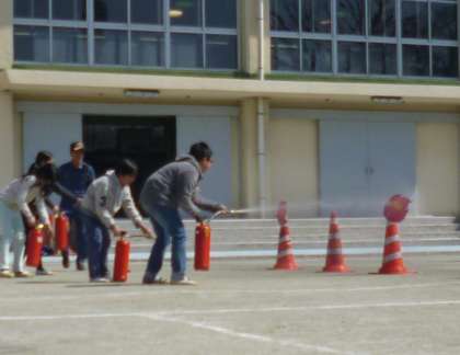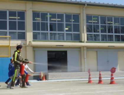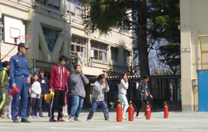 その後、玉川消防署用賀出張所の消防士さんからお話があり、消火器の使い方を教わりました。