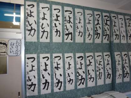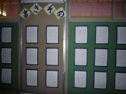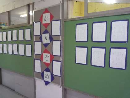 1/21 書き初め展をご覧くださいー1 公開日 2010/01/21 更新日 2010/01/21 校長室より 今週の月曜日から書き初め展が始まりました、各学級の廊下側の掲示板に張ってあります。1・2年生は硬筆書写、3年生以上は毛筆です。1年生の文字もずい分丁寧で上手に書けるようになりました。毛筆は、力強く堂々と書くようにしました。
