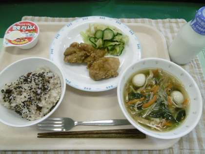 今日の給食は、お祝い献立です。1年の最後の給食ということで、みなさんの進級・卒業をお祝いして、お赤飯を炊きました。クイズです。みなさんは、1年間で何回給食を食べたでしょうか?