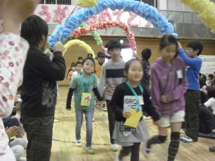 4月6日に入学した1年生127名を迎えて、盛大に1年生を迎える会が行われました。6年生からもらった手紙の入ったポシェットを肩から掛け、2年生の演奏に合わせて、6年生のお兄さん、お姉さんと手をつないで花のアーチをくぐりました。