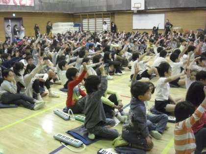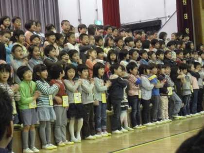 2〜6年生のお兄さん、お姉さんから歌とクイズのプレゼントをもらい、そのお礼に、「ドキドキドン」の歌を立派に歌いました。入学して10日もたたないとは思えないほど、立派に歌う姿に、先生たちやお兄さん、お姉さん達もびっくりしてしまいました。
