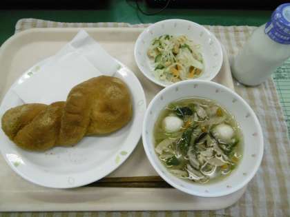 4/24 本日の給食 公開日 2015/04/25 更新日 2015/04/25 給食 〜今日の献立〜 きなこあげパン 牛乳 春雨スープ 大豆入り中華サラダ 〜給食メモ〜 今日は、あげパンにまぶしてある「きなこ」のクイズを出したいと思います。「きなこ」は、何から作られているでしょうか? 1.米 2.大豆 3.ごま ※クイズのこたえは、「食材がとれたところ…」の最後にのせています。 食材がとれたところ・・・ 閉じる 豚肉…茨城県 にんじん…徳島県 しょうが…高知県 長ねぎ…千葉県 キャベツ…愛知県 きゅうり…埼玉県 クイズのこたえは、2の「大豆」です。きなこは、大豆を炒って、粉にしたものです。大豆は、きなこの他にもしょうゆやみそ、とうふなどいろいろなものに変身します。大豆には、体をつくってくれるたんぱく質や、骨や歯を丈夫にしてくれるカルシウムがたくさん入っています。残さず食べましょう。