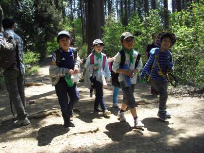 4年生の遠足は高尾山の山登りです。5,6人のグループで協力して山頂を目指します。天気は快晴で絶好の遠足日和でした。気温が高めで日差しが強かったですが、登山道は森の中で吹く風も心地よかったです。