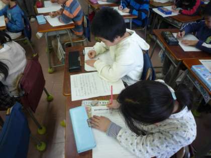 友達の作文のよさを発見して、自分の作文に生かす学習です。一度書いた作文を推敲することは難しいのですが3組の子どもたちは頑張りました。比喩表現を上手に使って書き足しをしている様子を見ていると、ずいぶん成長したな!と思いました。