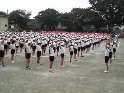 今日の全校朝会は、先生のお話は短めにして、運動会の始めの体操の練習です。用賀小学校では、ラジオ体操を始めの体操に採用しています。体全体をしっかりと伸ばしたり、動かしたりして運動の準備をするのには、ラジオ体操はよい運動だと考えているからです。
