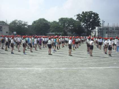 本日は、体育朝会も兼ねていたため、紅白帽子を着用しての全校朝会となりました。