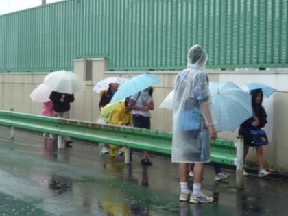 こんな日は、傘が飛ばされたり、めちゃくちゃに壊れたりして困っている子どもたちが多いのです。でも、ランドセルまですっぽり覆っているレインコートを着て、両手を開けている子、長靴を履いている子はとても安全に見えました。