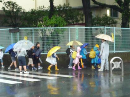 今日の登校時は、風雨が強く、まるで台風のような有様でした。用賀小学校では、子どもたちの安全を守るために、教職員が学区域に出て登校指導をしました。特に交差点は危険ですから、学校主事以外に何人かの教員で安全の確保です。