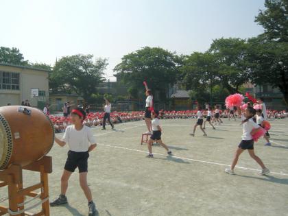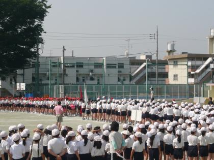 体育朝会で応援合戦の練習をしました。まず応援隊形を全体で作ります。運動会では、開閉会式で並んだり、応援席の場所に座ったり、大玉送りの場所に並んだりと様々な隊形を覚えなくてはいけません。全体がいっしょに動くことは大変ですが、あまり時間を取られることなく、実際の応援合戦の練習もすることができました。声が両組共に大変よく出ていました。