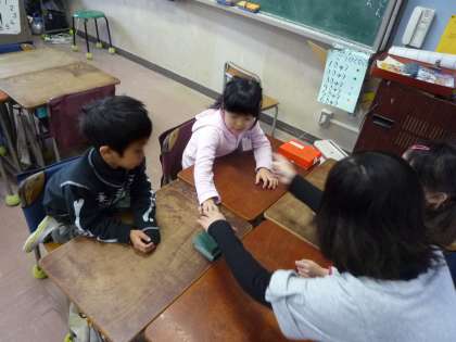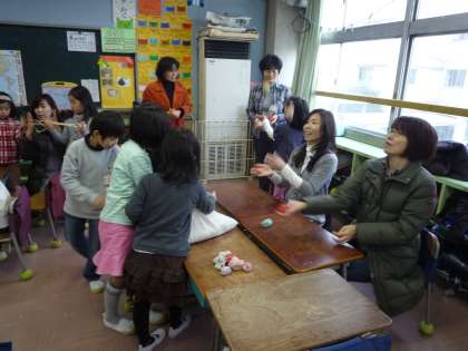 1年生の生活科の昔遊び体験です。今日は学校公開週間でもありますからたくさんの保護者の方々一緒に遊んでくださいました。