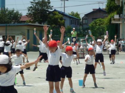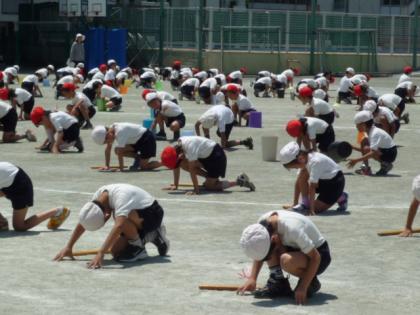 2年生の表現種目は、世界のリズム・踊りです。100円ショップで購入したのでしょうか、ゴミ箱は、アフリカの太鼓?