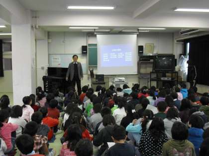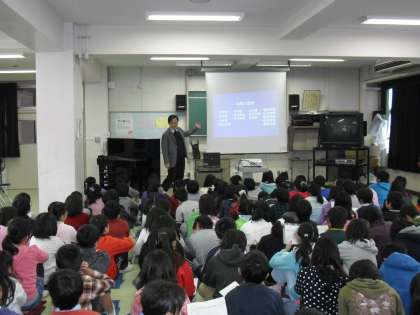 今日は4年生食育授業みそづくりの1回目です。東京農業大学短期大学部醸造学科教授の館先生をお迎えして、みその種類やつくり方、みそにはいろいろな味や色があることを学びました。子どもたちはメモをとりながら興味をもって熱心に聞いていました。2月の24日には本校で大豆あらい、25日には大学で本格的にみそづくりを始めます。発酵、熟成をは大学で行い、5年生になったら家に持ち帰ります。東京農業大学の全面的な協力を得てのみそづくりです。楽しみにしていてください。
