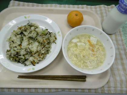 6/29 本日の給食 公開日 2015/06/29 更新日 2015/06/29 給食 〜今日の献立〜 磯おこわ 牛乳 そうめん汁 くだもの(冷凍みかん) 〜給食メモ〜 今日は、磯おこわに使った「昆布」のクイズを出したいと思います。昆布には、カルシウムがどのくらい入っているでしょうか? 1.牛乳の半分 2.牛乳の2倍 3.牛乳の7倍 ※クイズのこたえは、「食材がとれたところ…」の最後にのせています。 食材がとれたところ・・・ 閉じる 米…埼玉県 もち米…山形県 鶏肉…岩手県、宮崎県 鶏卵…岩手県 にんじん…千葉県 だいこん…北海道 長ねぎ…茨城県 冷凍みかん…長崎県 クイズのこたえは、3の「牛乳の7倍」です。カルシウムは、骨を丈夫にしてくれます。小学生は骨が成長する時期なので、カルシウムをきちんととることが大切です。海藻や牛乳、小魚などを上手に組み合わせて、カルシウムをとるように心がけましょう。