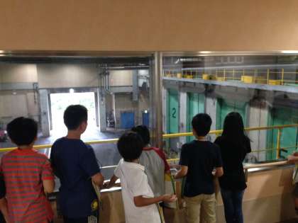 先週の1組4組同様、清掃工場ではビデオを見たり、工場の方のお話を聞いたりしました。また、工場内では、大きなごみ置き場(ごみバンカ)やクレーンを見学しました。ごみバンカにごみが落とされたり、クレーンでたくさんのごみが掴まれたりすると、子どもたちから驚きの声があがっていました。