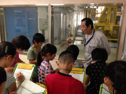 資源循環センター「リセタ」では、ガラス瓶をリサイクルするための工程と再利用について学習しました。粉々になったビンが道路で使われていることを聞くと、子どもたちは驚いた様子でした。