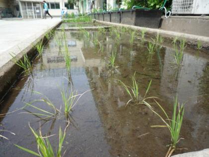 5年生は、社会科で農業「稲作にはげむ人々」の学習をします。そこで、学校の小さな『用賀田んぼ』に田植えをしました。秋の実りまでの体験学習です。