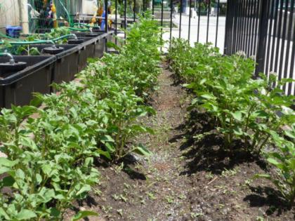 6年生は、理科の学習でジャガイモを育てます。4月早々に植えた種芋から芽が出て、そろそろ花をつけるほどになりました。植物や動物の栄養について調べる時にも観察教材になります。