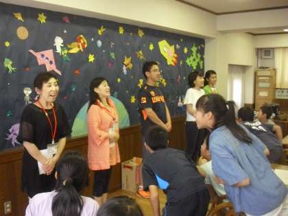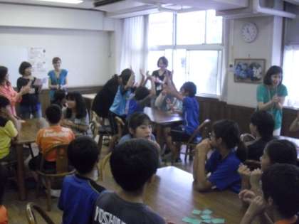最後のStereo Gameは、先生と英語支援委員さん5人が1列に並んで、一斉に別々の単語を発声し、グループで答えるゲームでした。