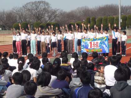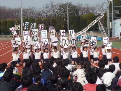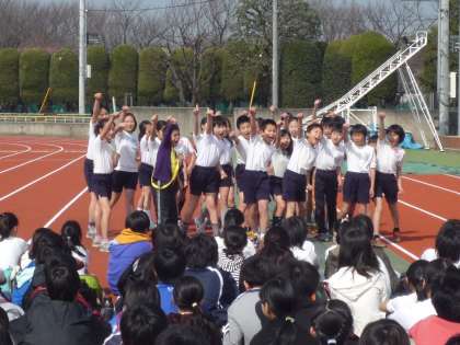 3学期に入ってから少しずつ練習してきた駅伝大会が今日行われました。日中の気温が15度を超える砧の総合運動で今までの練習の成果を力いっぱい発揮するのです。まず、各学級の選手宣誓から始まりましたが、どの学級も工夫を凝らして自分たちの気持ちを表明します。5・6年8学級の写真を掲載します。